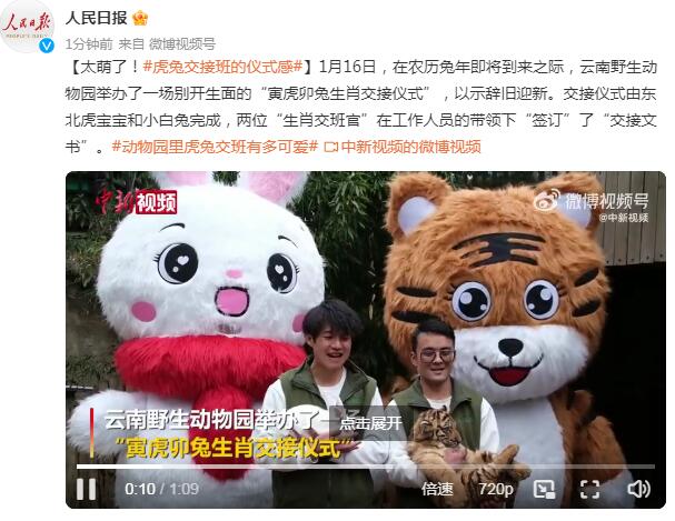 1月16日,在农历兔年即将到来之际,云南野生动物园举办了一场别开生面的“寅虎卯兔生肖交接仪式”,以示辞旧迎新。交接仪式由东北虎宝宝和小白兔完成,两位“生肖交班官”在工作人员的带领下“签订”了“交接文书”。