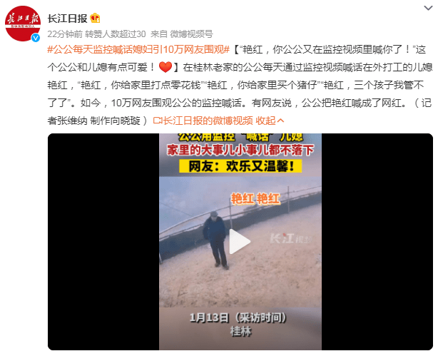 在桂林老家的公公每天通过监控视频喊话在外打工的儿媳艳红,“艳红,你给家里打点零花钱”“艳红,你给家里买个猪仔”“艳红,三个孩子我管不了了”。如今,10万网友围观公公的监控喊话。有网友说,公公把艳红喊成了网红。(记者张维纳 制作向晓璇)