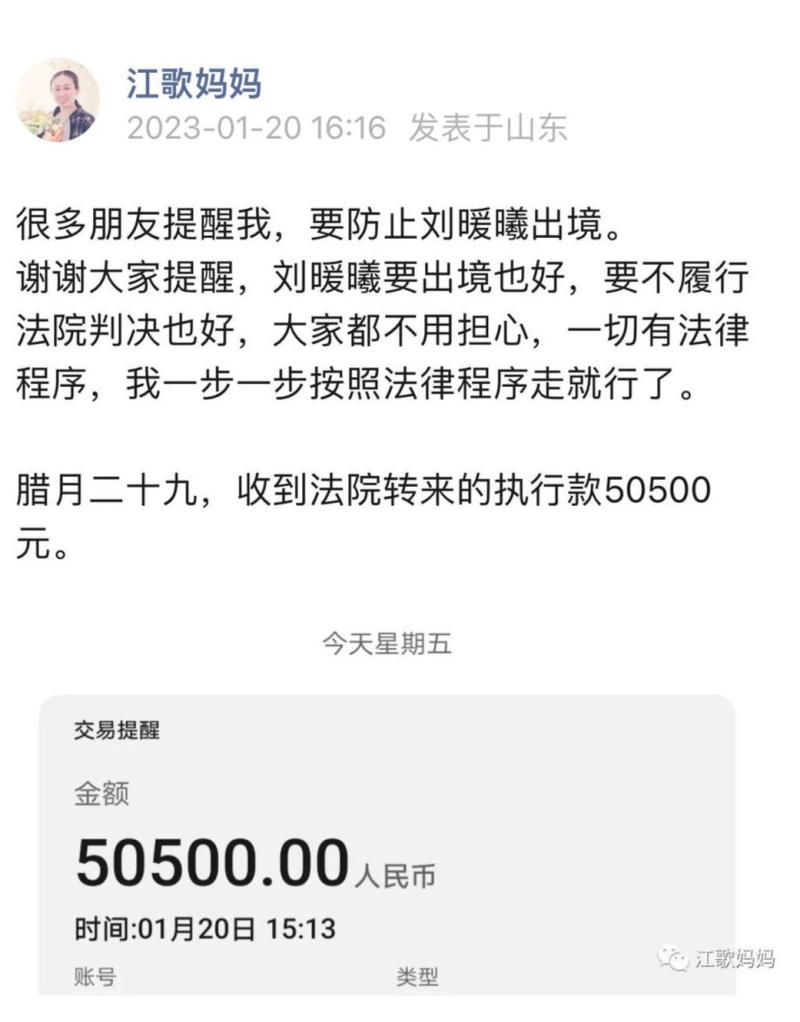 刘鑫(现更名刘暖曦)在江歌妈妈江秋莲与她生命权纠纷案一审二审败诉后,未在指定期限履行给付近72万元的义务,成为被执行人并被限制消费。1月20日,江秋莲发布消息称,农历腊月二十九,她已收到法院转来的执行款50500元。红星新闻记者了解到,这是此案刘鑫被执行的首笔款项。