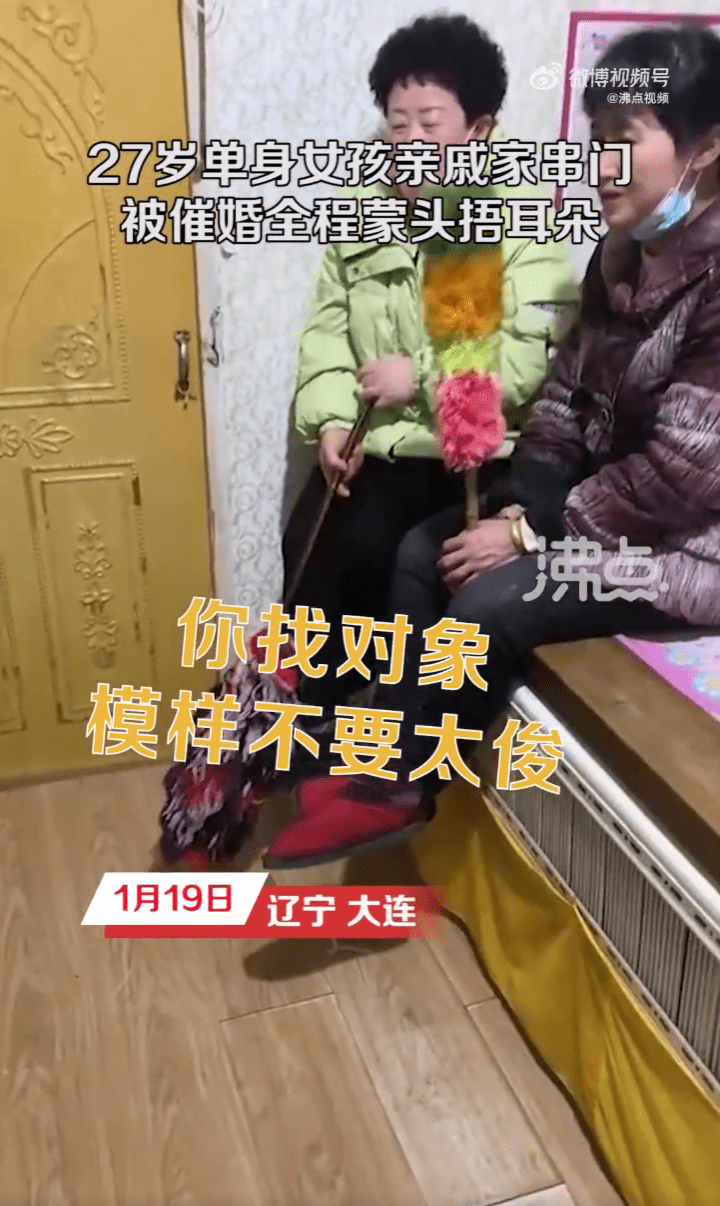 1月19日,辽宁大连。单身女孩和妈妈去亲戚家串门,被小姑不停地催婚,女孩用衣服全程捂住耳朵。拍摄者胡女士称,妹妹今年27岁还没有对象,小姑和她妈妈就一直催婚,妹妹就一直用衣服捂住耳朵。最后妹妹实在扛不住压力,第二天被强迫相亲去了。