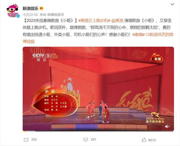 在 2023 央视春晚上,黄渤演唱歌曲《小哥》,又穿连体服上跑步机。歌词质朴,旋律朗朗," 那雨浇不灭我的心中,燃烧的那颗太阳 ",唱出快递小哥、外卖小哥、司机小哥们的心声。