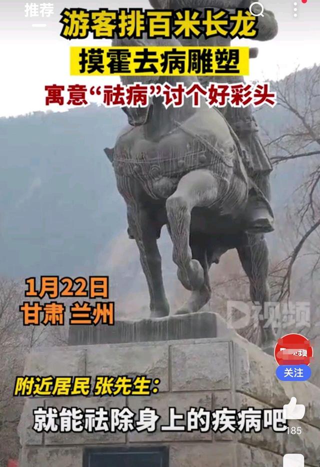 近日,在甘肃兰州,竟然出现感觉与时代格格不入的一幕,游客为了新年驱邪避病,竟然排成几百米的长队,不畏严寒的触摸西汉时期抗击匈奴的英雄霍去病雕塑。