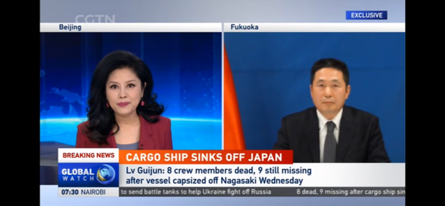 北京时间1月26日12时30分,驻福冈总领事律桂军就香港籍货轮在长崎附近海域沉没事,与中国国际电视台CGTN视频连线并接受采访。