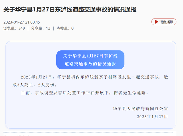 华宁县人民政府新闻办公室通报,1月27日,华宁县境内东泸线新寨子村路段发生一起交通事故,造成3人死亡、2人受伤。