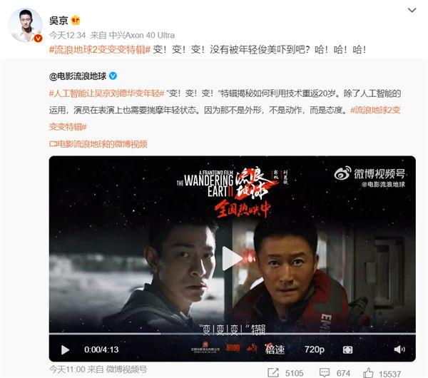吴京也在个人微博上转发了该视频,笑称:“没有被年轻俊美吓到吧?哈!哈!哈!”。