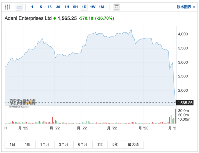 当地时间2月2日,阿达尼集团旗下的10家上市公司股价集体重挫,其中,旗舰企业Adani Enterprises更是一度狂泻30%,截至收盘,跌幅仍高达26.7%。而在前一日,Adani Enterprises股价已暴跌28%,近2个交易日累计跌幅超47%。