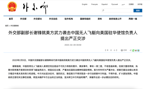 据外交部网站6日消息,2月5日,中国外交部副部长谢锋奉命代表中国政府就美方武力袭击中国民用无人飞艇向美国驻华使馆负责人提出严正交涉。
