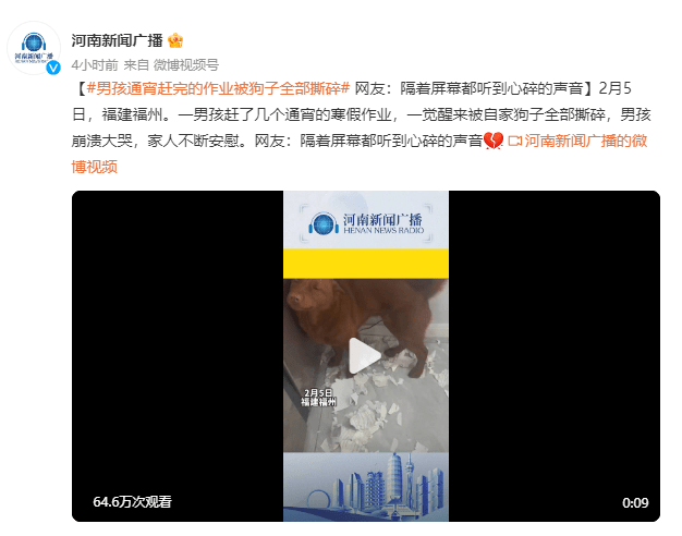 2月5日,福建福州。一男孩赶了几个通宵的寒假作业,一觉醒来被自家狗子全部撕碎,男孩崩溃大哭,家人不断安慰。网友:隔着屏幕都听到心碎的声音。
