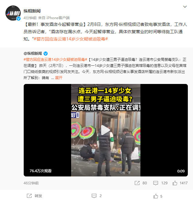 昨天(2月7日),一则连云港市一14岁少女遭三男子强迫在宾馆吸毒的信息以及父母在宾馆门口烧纸祭奠的视频引发网友关注。今天,东方网·纵相视频记者从事发酒店所属的连云港市新东派出所了解到:确有此事,但接线民警称“具体办案人员不是我”。连云港市公安局禁毒支队工作人员则表示:“这个事还在调查,一切以我们市局新闻中心(为准)。