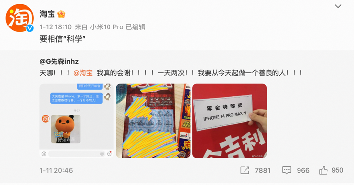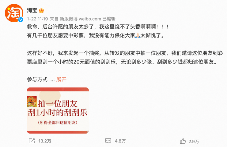 1月22日,为了满足网友们的愿望,淘宝在官方微博发起“发财锦鲤”活动。最终,来自山东的阿小姐获得 “刮1小时20元面值刮刮乐”机会。