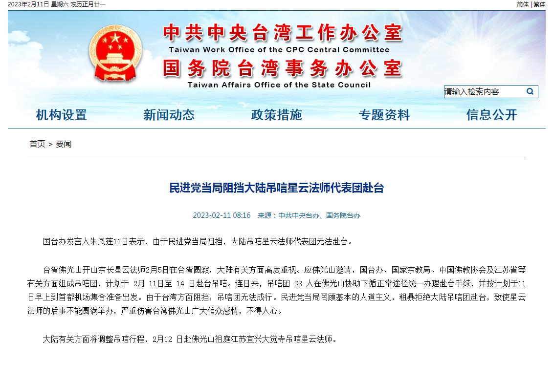 朱凤莲表示,台湾佛光山开山宗长星云法师2月5日在台湾圆寂,大陆有关方面高度重视。应佛光山邀请,国台办、国家宗教局、中国佛教协会及江苏省等有关方面组成吊唁团,计划于2月11日至14日赴台吊唁。连日来,吊唁团38人在佛光山协助下循正常途径统一办理赴台手续,并按计划于11日早上到首都机场集合准备出发。由于台湾方面阻挡,吊唁团无法成行。民进党当局罔顾基本的人道主义,粗暴拒绝大陆吊唁团赴台,致使星云法师的后事不能圆满举办,严重伤害台湾佛光山广大信众感情,不得人心。