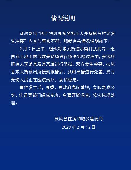 2月7日上午,组织对城关街道小留村扶托寺一组国有土地上的违建养猪场进行依法拆除过程中,养猪场所有人李某某及其亲属进行阻挡,双方发生冲突。扶风县东大街派出所接到报警后,及时出警进行处置,双方受伤人员正在医院治疗,病情稳定。