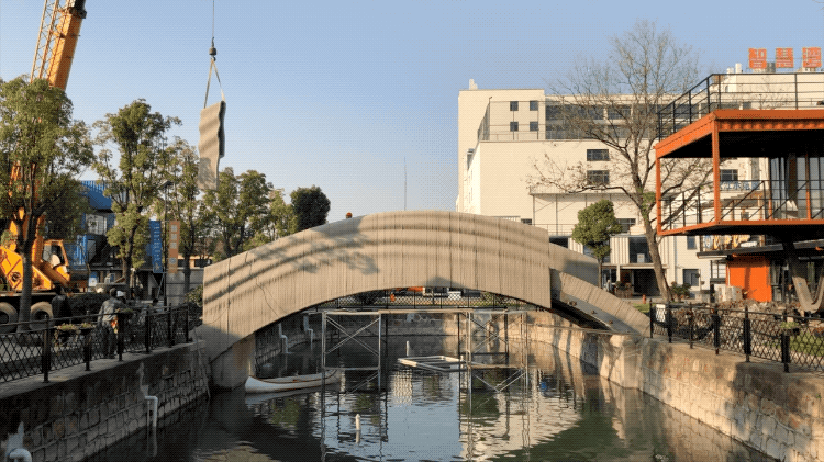 两台3D打印机械臂,450小时,完成全部混凝土构件。再将构件运到现场,组装。造价只有普通桥梁的三分之二。