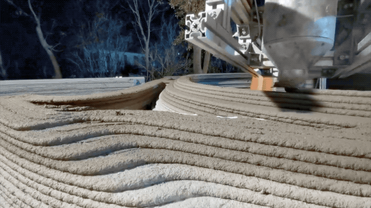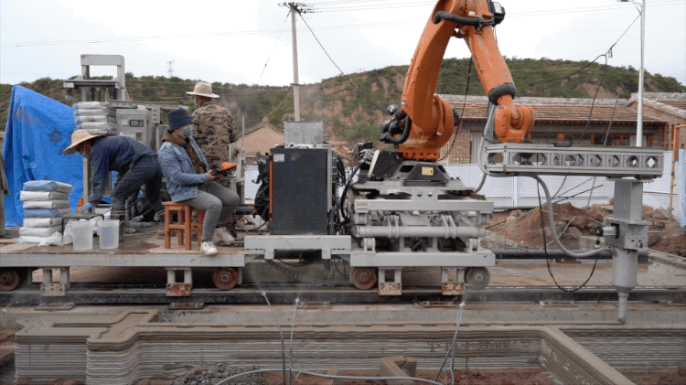 机械臂前端的打印嘴会吐出纤维混凝土材料,一层一层地叠层,从建筑的基础开始打,打到墙,建造过程全部现场完成,一度引来全村人围观。