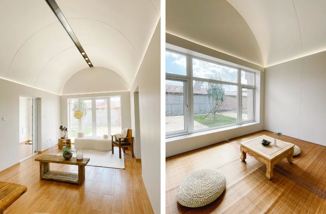 室内共有5个房间,两间卧室,一个客厅,外加卫生间、厨房,一家人非常满意。室内因为做的是拱顶,特别敞亮。