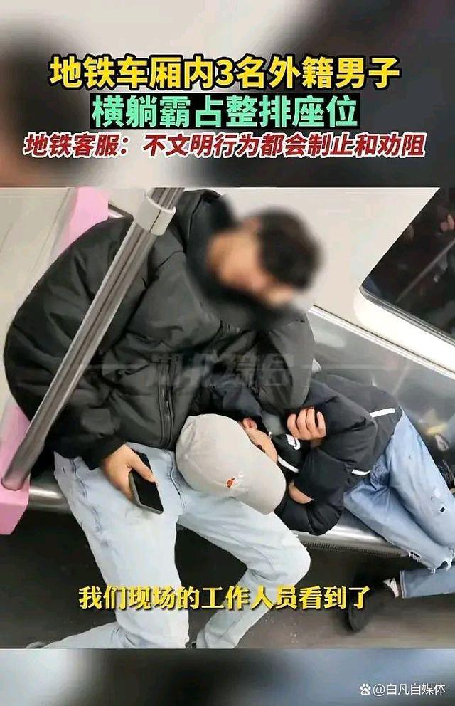 武汉地铁3名外籍男子横卧整排座位# 任何一个国家的人都有文明的和不文明的,有好人也有人渣,这并不奇怪。据报道,武汉的三名外国男子躺着并占据了一排座位。我不知道这是什么时候的事。当时地铁是人多还是空?如果是高峰时段,周围很多人都是站着没座位,这三个老外还这样占座,应该严肃处理;如果地铁是空的,乘客座位很充裕,这三个人特别累,需要休息,那也是可以理解的。