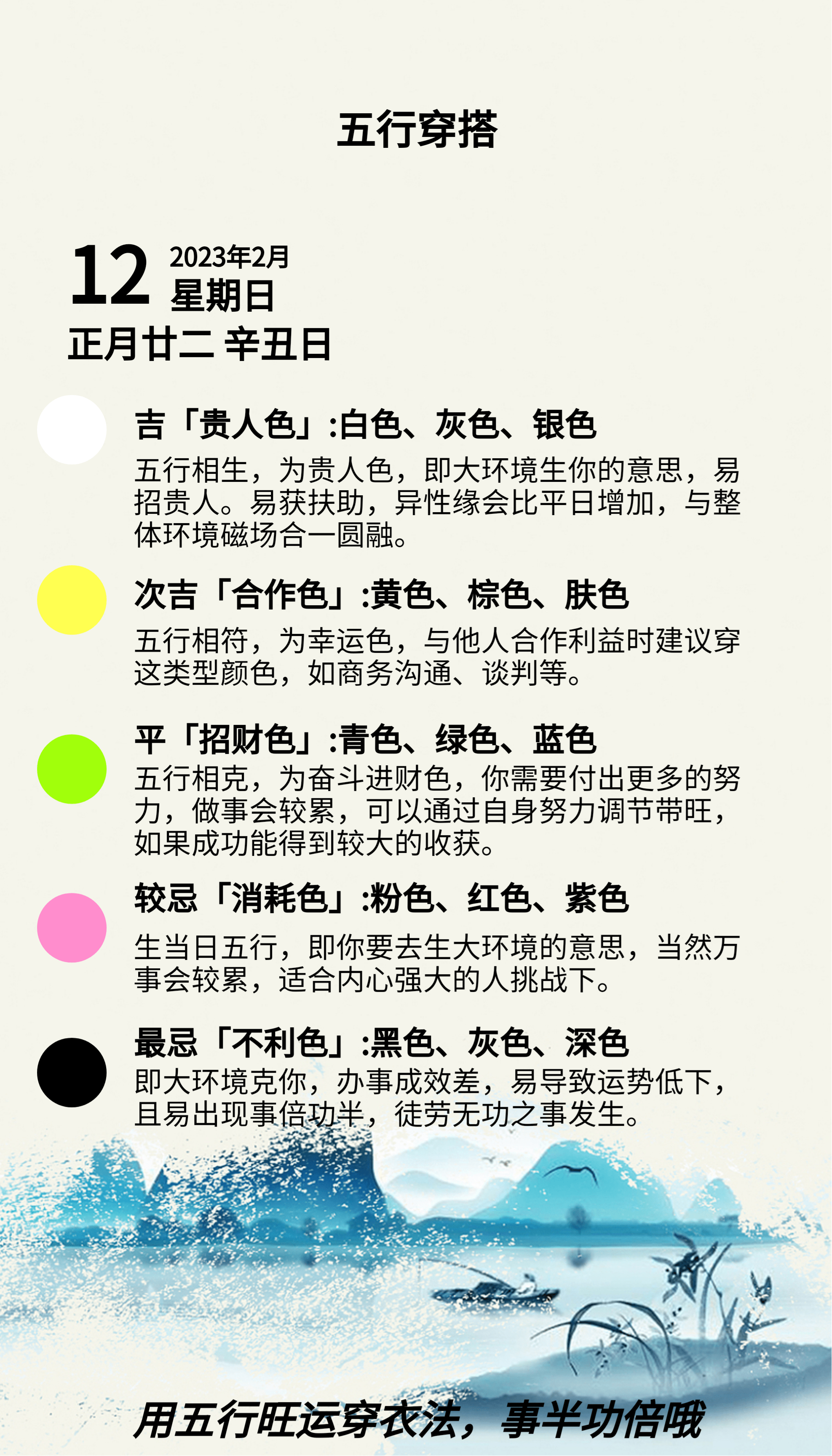 2023年2月12日五行穿衣指南,五行穿衣每日分享今天穿什么颜色?