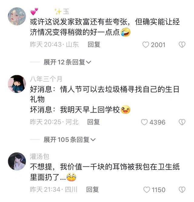 近日,有网友在社交平台分享自己在情人节这天“捡垃圾”的经历,迅速引发了大量网友共鸣。
