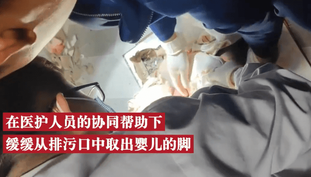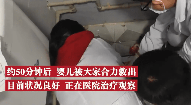 这种情况其实很少见,但是一旦碰到这个情况一定不要擅做主张或者心神不定,一定要冷静下来分析如何才能有效救助。在有情况的情况下,观察婴儿位置,若能自己取出就应该将其取出放置安全地方,并及时通知医生检查和治疗。若不能自己取出,应保持冷静,尽快拨打消防救援电话,并在救援过程中堵住洞口,防止婴儿继续滑落,最终导致悲剧发生。婴儿,防止婴儿被刮伤,然后用工具将排污口周围水泥敲碎。经过50分钟左右救助,婴儿成功被救出,目前呢婴儿健康良好,正在医院治疗观察。