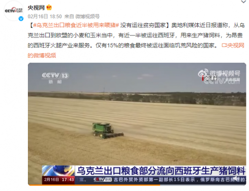 2月16日报道 据今日俄罗斯电视台网站15日报道,奥地利媒体的一项调查结果显示,乌克兰出口到欧盟的小麦和玉米中,有近一半最终被用来饲养西班牙的猪,以生产著名和昂贵的西班牙火腿。尽管黑海走廊被宣传为向非洲和亚洲提供粮食的一个通道,但基辅出口的大部分粮食最终流向了欧盟。