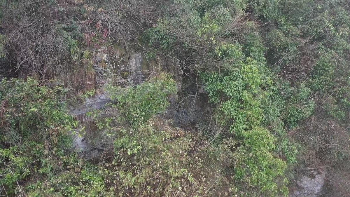 2月16日,极目新闻记者与民警来到新塘乡下塘坝村,只见刘某富一家所居住的房屋四面环山,山雾萦绕,怪石林立,路旁杂草丛生。因刘某富藏身的山洞处在峭壁上,且周边地面湿滑、荆棘遍布,记者无法步行靠近山洞,只得用无人机观察。航拍显示,山洞外树木茂密,藤蔓交错,洞口很是隐蔽。办案民警介绍,山洞里有被子、锅碗瓢盆等日常用品。