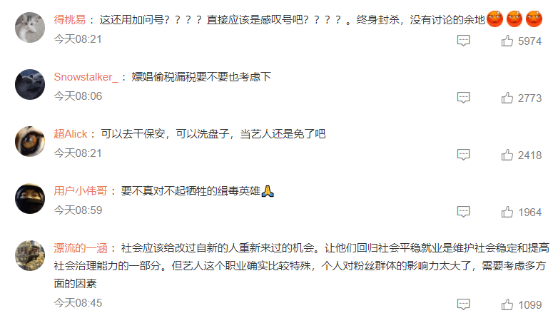 有网友认为:涉毒艺人复出,是对缉毒警察的背刺,对不起牺牲的缉毒警察。