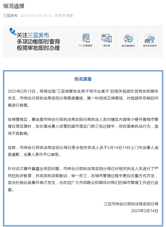 通报指出,2024年2月13日,网络出现“三亚城管收走孩子写作业桌子”的相关视频引发网友和媒体关注,三亚市综合行政执法局吉阳分局高度重视,第一时间成立调查组,对视频所反映的问题进行核查。