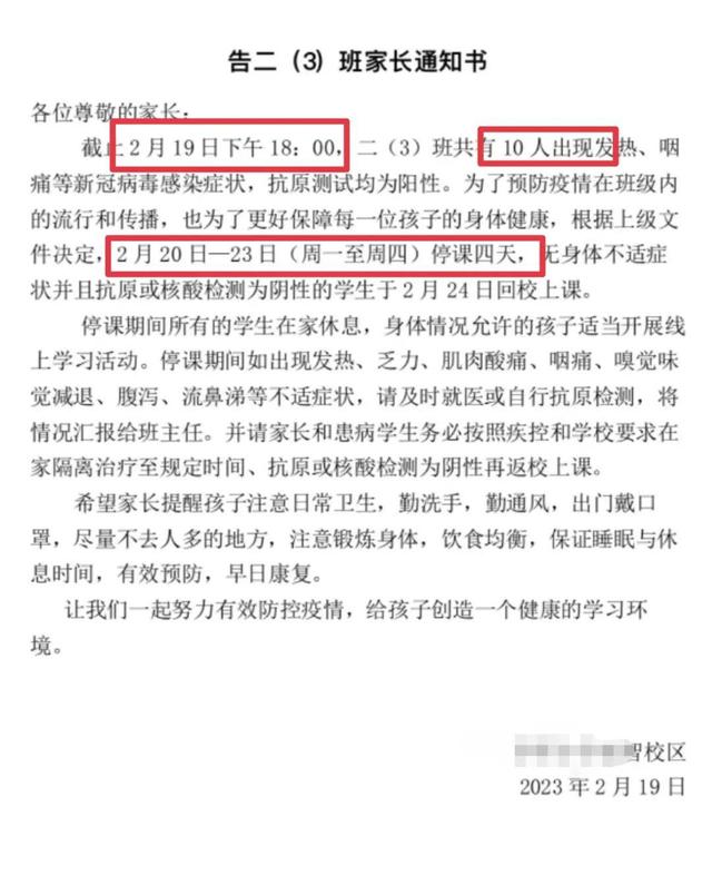 该通知称,为了预防疫情在班级内的流行和传播,也为了更好保障每一位孩子的身体健康,根据上级文件决定,2月20日—23日(周一至周四)停课四天,无身体不适症状并且抗原或核酸检测为阴性的学生于2月24日回校上课。