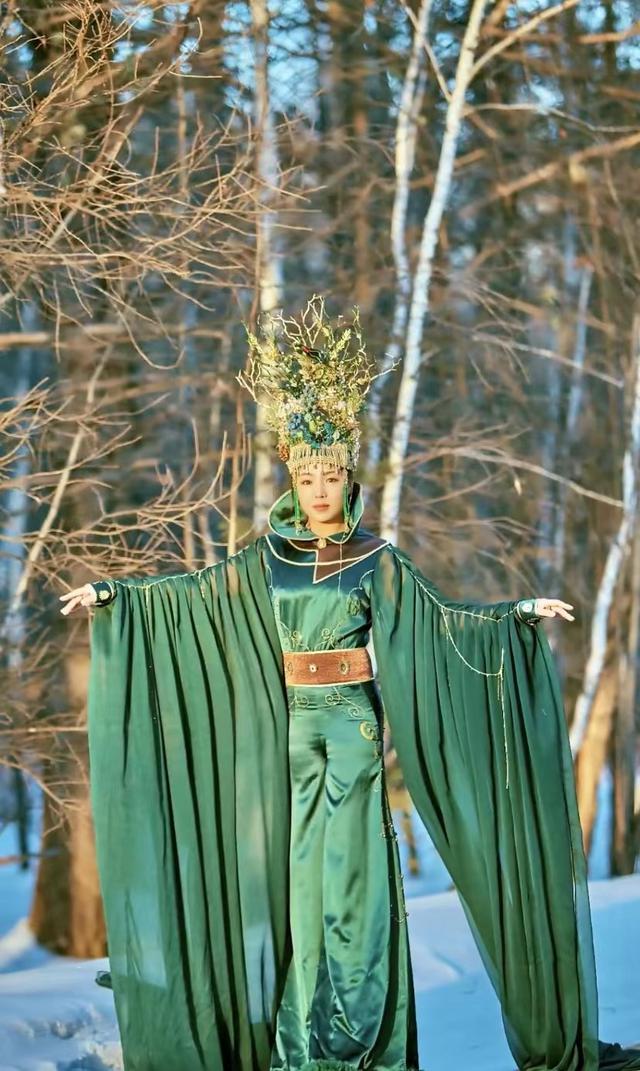 都波:这两套衣服是由鄂伦春族的民族服饰设计而来,一套是森林女王主题,一套是白鹿仙子主题。我不是鄂伦春族人,但我很了解他们,鄂伦春族也叫 " 使鹿部落 ",是从白桦林走出来的民族。