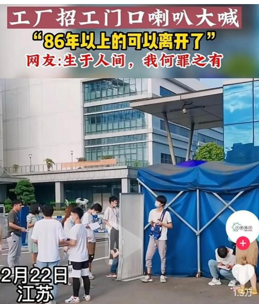 工厂门口大喇叭:86年以上可以走了视频登上热搜,具体怎么回事?据报道,江苏某工厂门口,一片热闹非凡的场面,人山人海,求职者攒动,大家都在期待着能够找到自己理想的工作。然而,一阵喇叭声响起,打破了众人的美梦,招工人员大声宣布:“86年以上的,现在就可以离开了!”这意味着,35岁以上的求职者,已经被淘汰出局。看过视频网友纷纷评论称“在不断的挫折中,依然坚持不懈,相信有一天,会找到自己理想的工作。”