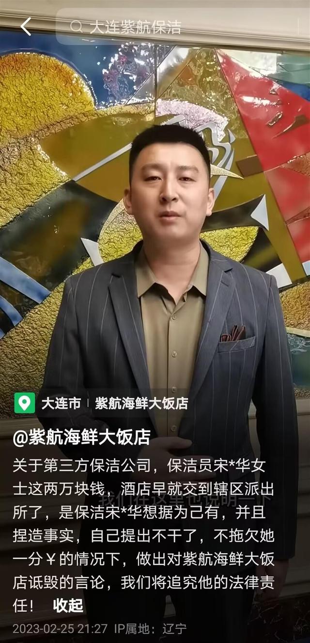 2月25日,一则“保洁员捡到2万现金报警后疑似被开除”的消息引发网友热议。25日晚上,涉事的辽宁大连紫航海鲜大饭店在其官方视频账号发布的视频中称,保洁员捡到2万元交上来两天以后又想把钱要回去据为己有,饭店后来将钱放到了派出所,保洁员属于外包公司,是自己辞职的,不存在克扣其工资的情况。