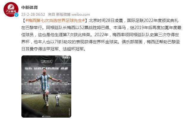 北京时间28日凌晨,国际足联2024年度颁奖典礼在巴黎举行。阿根廷队长梅西以52票战胜姆巴佩、本泽马,继2019年后再度加冕年度最佳球员,这也是他生涯第7次获此殊荣。2024年,梅西率领阿根廷队队史第三次夺得世界杯,他本人也以7球3助攻的表现获得世界杯金球奖。俱乐部层面,梅西还帮助巴黎圣日耳曼夺得法甲冠军、法超杯冠军。