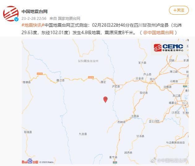 中国地震台网正式测定,02月28日22时46分在四川甘孜州泸定县(北纬29.63度,东经102.01度)发生4.8级地震,震源深度8千米。