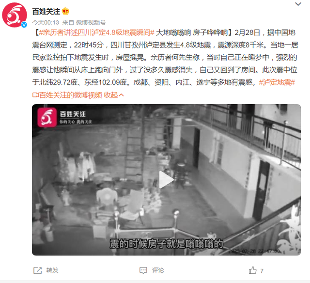 当地一居民家监控拍下地震发生时,房屋摇晃。亲历者何先生称,当时自己正在睡梦中,强烈的震感让他瞬间从床上跑向门外,过了没多久震感消失,自己又回到了房间。此次震中位于北纬29.72度、东经102.09度。成都、资阳、内江、遂宁等多地有震感。