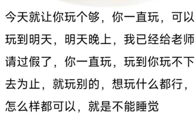 “他想玩就让他玩个够!”爸爸黄先生介绍,凌晨1点钟左右,他发现儿子还在玩手机,被气的不行,于是特意给儿子请了一天假,让其自由玩手机。“我一直在旁边看着,吃饭喝水都是允许的。”