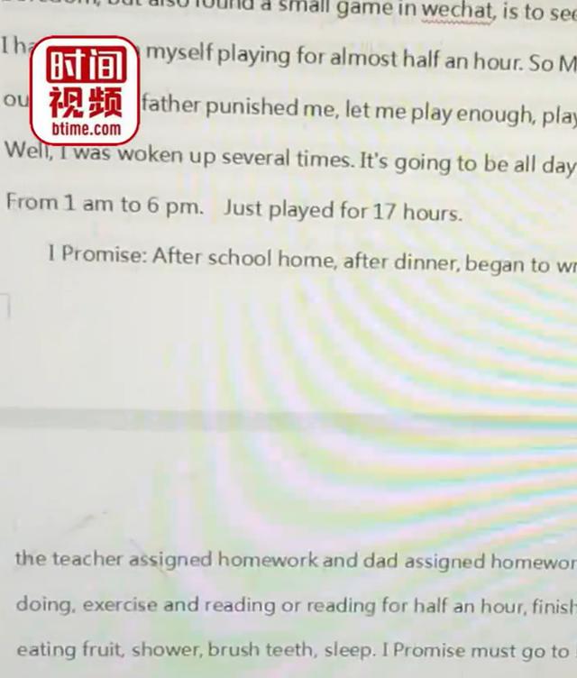 黄先生还说,自己认为这个方法效果不错,儿子已经认识到了错误,并用英文写了保证书。“他被我发现时就认识到了错误,我认为还是有作用的,因为他会对这件事情印象深刻。”