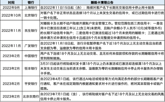 据第一财经消息,记者注意到,2月银行睡眠卡清理进程明显加速,中国银行、平安银行、恒丰银行、北京农商行均发布通知。此前,招商银行、兴业银行、浦发银行等多家银行也曾发布开展长期不动户清理工作或信用卡客户持卡数量上限公告。