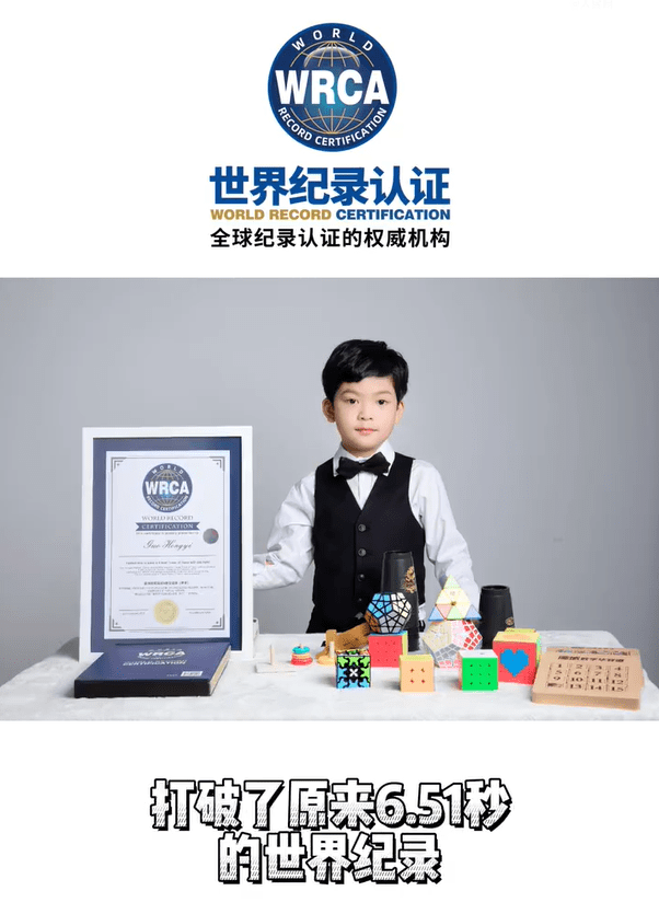 3月10日,据人民网报道,近日,据世界纪录认证机构(WRCA)官方权威发布,来自中国厦门市的8岁男孩郭弘奕,以单手成功完成4层汉诺塔,用时4.305秒。经世界纪录认证(WRCA)官方审核,郭弘奕成功打破“最快时间完成4层汉诺塔(单手)”世界纪录,并颁发WRCA世界纪录认证证书,载入WRCA世界纪录全球数据库。
