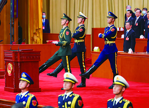 北京人民大会堂,国徽高悬、熠熠生辉,见证庄严而神圣的时刻。