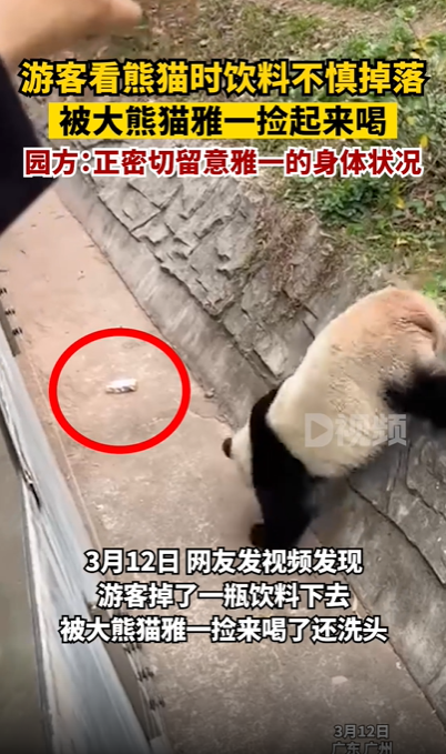 据西部决策网报道,有网友发视频表示,3月12日,在广州动物园内,一游客看熊猫时不慎掉落一瓶饮料,被大熊猫雅一捡来喝了,还洗头。该网友在视频字幕备注“我现在觉得有些地方不让带食物进(动物园)去是有道理的”。