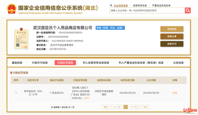 红星资本局3月13日消息,国家企业信用信息公示系统官网显示,近日,武汉屈臣氏个人用品商店有限公司(下称“武汉屈臣氏”)因违反广告法,遭汉阳区市场监管局行政处罚。