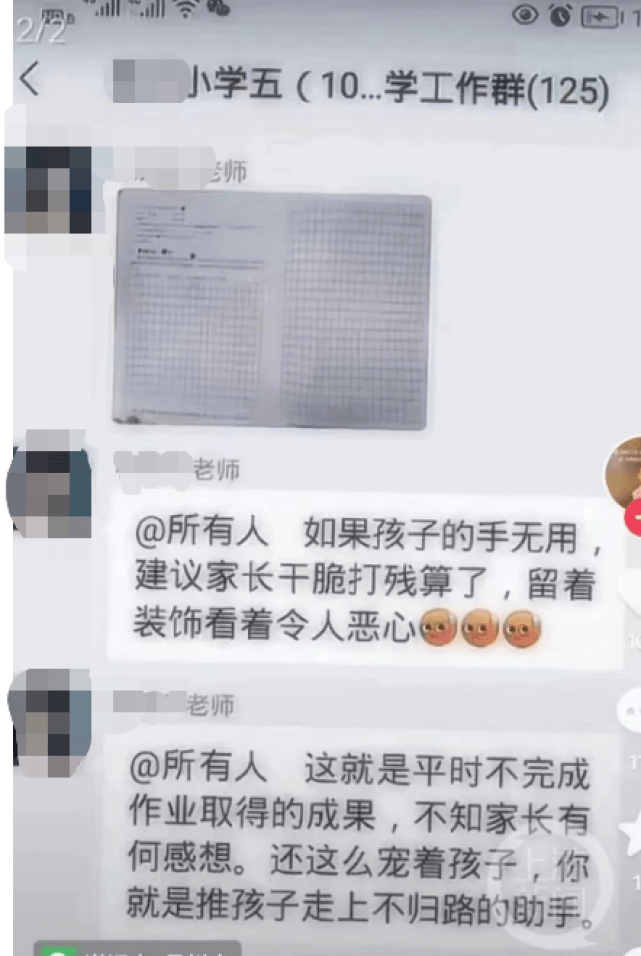 在吴川某小学125人的家长群中,有一位叫“杨某某的老师”的 ID,发了一张空白作文的卷子的图片,并配上了一句话:“@所有人,如果孩子的双手没有任何用处,我建议家长把他的手给打残算了,留着当摆设,实在是太恶心了。”这就是平时不完成家庭作业的后果,还这么惯着,你简直就是让孩子走上不归路的始作俑者。”