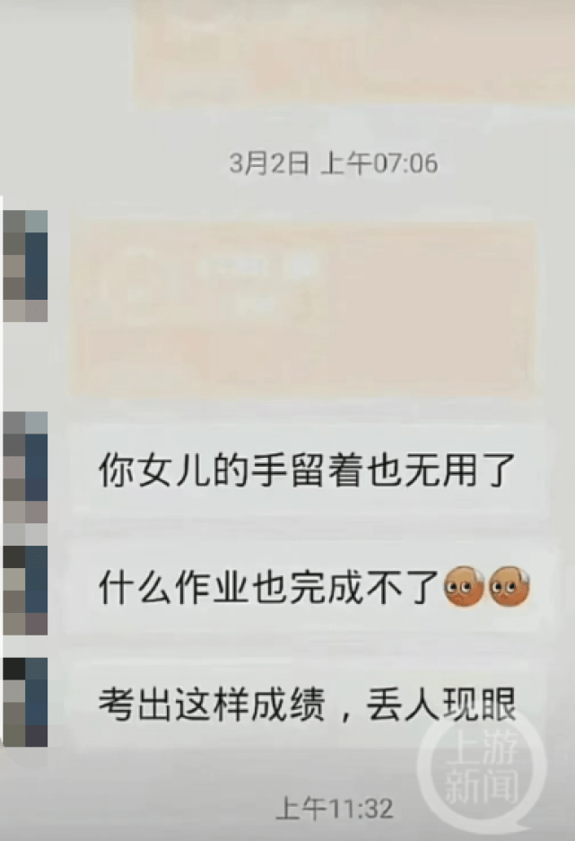 另外一幅画面中,该名“杨某某教师”曾向该学生的父母说过“您的女儿有手也没有用,不能做任何功课,考试成绩如此之差,实在是太丢人了。