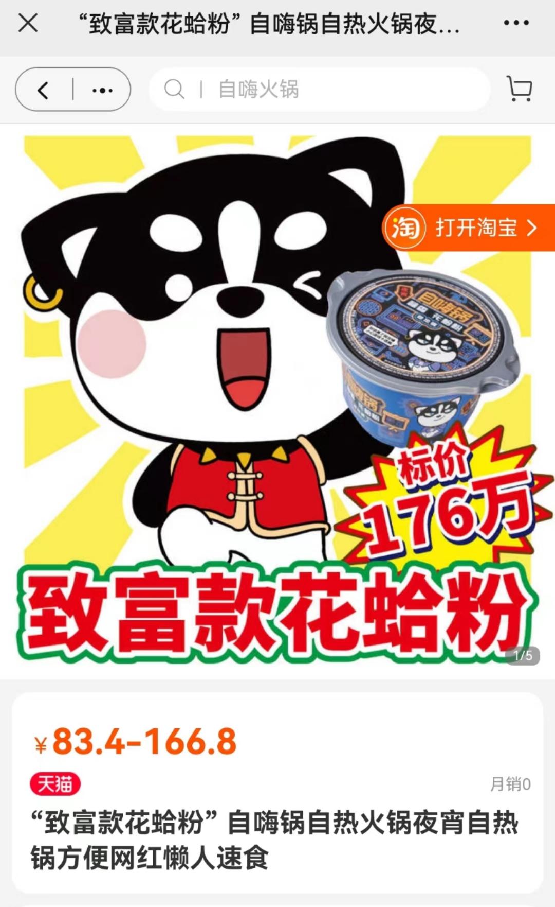 自嗨锅电商平台旗舰店同款产品中,产品图片显示“标价176万致富款花蛤粉”