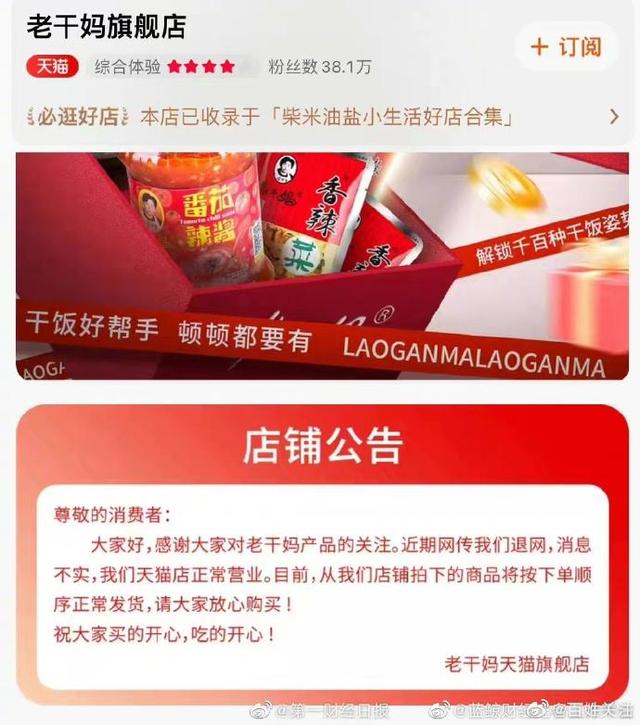 近期,有消息称老干妈微博、微信等多个官方社交账号长时间未更新,似乎要退网了。3月16日,老干妈官方店铺发布公告声明称,网传退网消息不实,店铺正常营业,请大家放心购买!