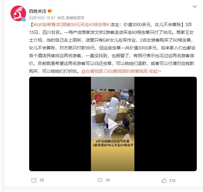 3月15日,四川甘孜。一特产店商家发文称2游客进店买走60根虫草只付了98元。商家王女士介绍,当时自己去上厕所,店里只有6岁女儿在写作业,2名女游客购买了60根虫草,女儿不会算账,对方就只付款98元,但这些虫草一共价值3000多元,后来家人们也都去各个酒店民宿找这两名游客,一直没找到,也报警了,有同行表示也见过这两名游客询价。目前就是希望这两名游客可以归还虫草,可以给她们退款,或者可以付清对应钱款购买,可以给她们打折的。@白鹿视频