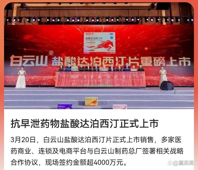 近日,白云山盐酸达泊西汀片正式上市销售,这是一款新型的抗早泄药物。据悉,多家医药商业、连锁及电商平台与白云山制药总厂签署了相关战略合作协议,现场签约金额超过了4000万元,这意味着盐酸达泊西汀将会在全国范围内得到广泛应用。