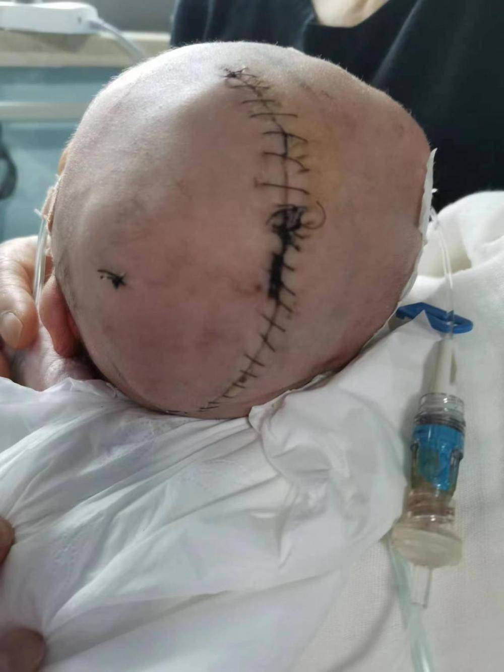 ▲开颅手术后,孩子头上留下长长的疤痕