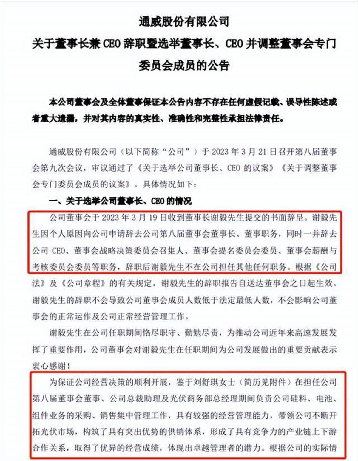 公告同时指出,通威股份的董事会选举刘舒琪为第八届董事会董事长,兼任公司CEO。