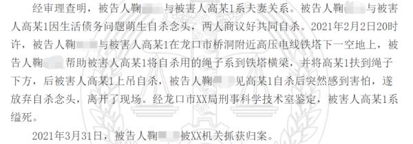 2024年2月2日20时许,鞠某某与高某在龙口市桥洞附近高压电线铁塔下一空地上,鞠某某帮助高某将自杀用的绳子系到铁塔横梁,并将高某扶到绳子下方,后高某上吊自杀,鞠某某见高某自杀后突然感到害怕,遂放弃自杀念头,离开了现场。